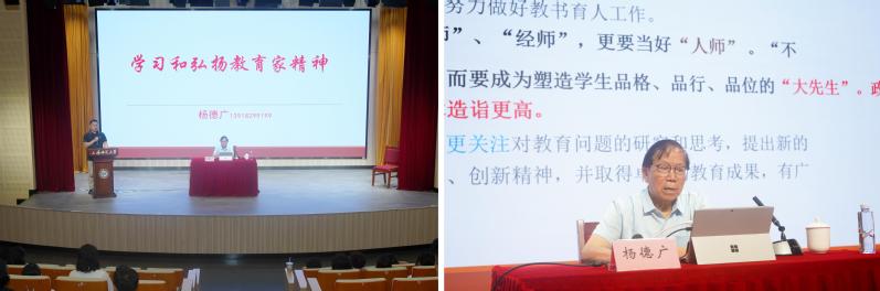 赠书仪式后,杨德广教授作“学习和弘扬教育家精神”专题讲座。他从教育家精神的概念入题,指出教育家既要当好“句读之师”“经师”,更要当好“人师”,不能只做传播书本知识的教书匠,要成为塑造学生品格、品行、品位的“大先生”。