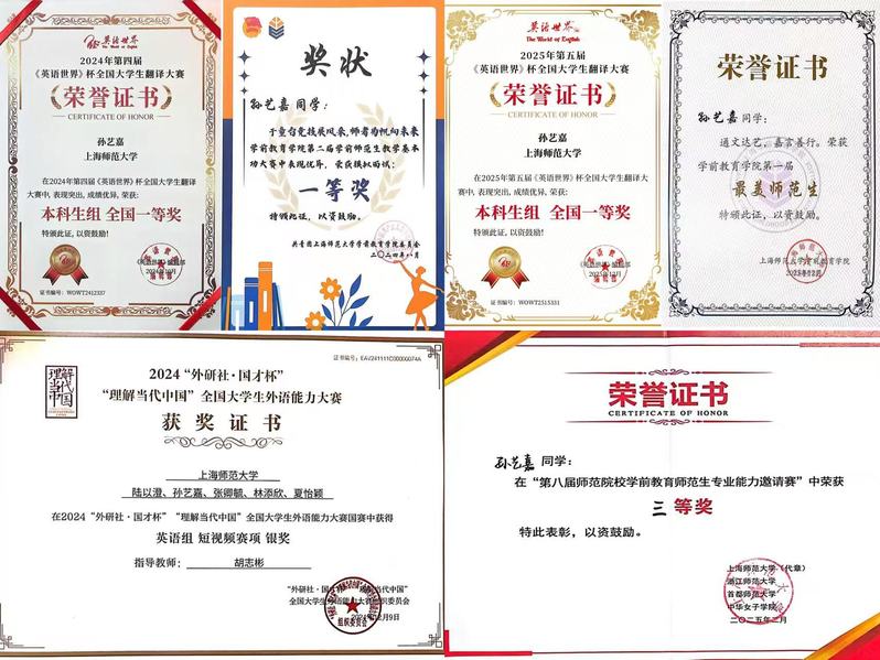 征途漫漫,学海无涯,她选择辅修英语专业以提升自己的综合实力,也在各类竞赛中屡创佳绩,连续两年在《英语世界》杯翻译大赛中斩获全国一等奖,在2024年“外研社·国才杯”全国大学生外语能力大赛中摘得国赛银奖,在2025年全国高校商业精英挑战赛中夺得国赛二等奖,努力成长为一名具备跨学科学习与应用能力的优秀教师。