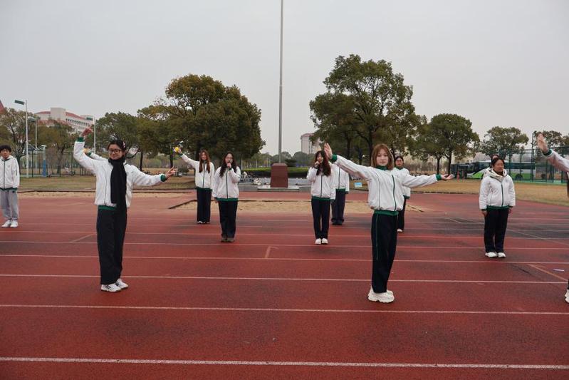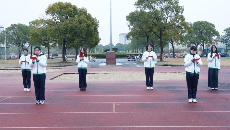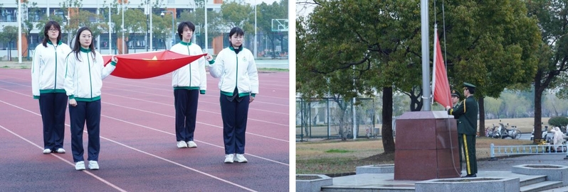 随着激昂的《义勇军进行曲》奏响,五星红旗在晨光中迎风舒展。全体师生行注目礼,齐声高唱国歌。