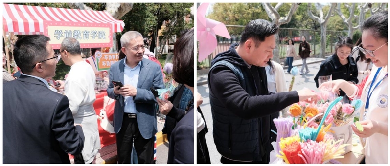 活动期间,上海师范大学党委副书记、副校长赵扬、学生工作部(处)部长朱政来到学院摊位视察,了解学院手作特色。学院党委书记杨成龙、副书记、副院长周泽龙及学院辅导员带头参与义卖活动,奉献爱心。