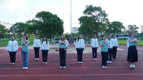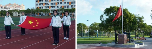 随着激昂的《义勇军进行曲》奏响,五星红旗在晨风中冉冉升起,全体本科生肃立注目,齐声高唱国歌。